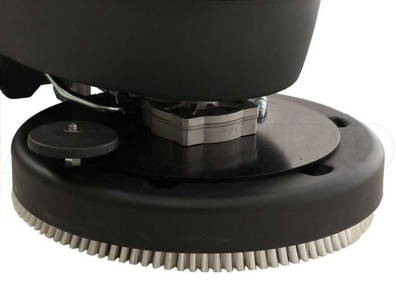 La macchina è dotata di spazzola rotante che aiutata dall'acqua e dal detergente ha il compito di lavare le superfici. All'avanzare della macchina la spazzola posteriore (squeegee), a contatto con il pavimento raccoglie l'acqua che contemporaneamente viene aspirata e convogliata nel serbatoio di recupero.