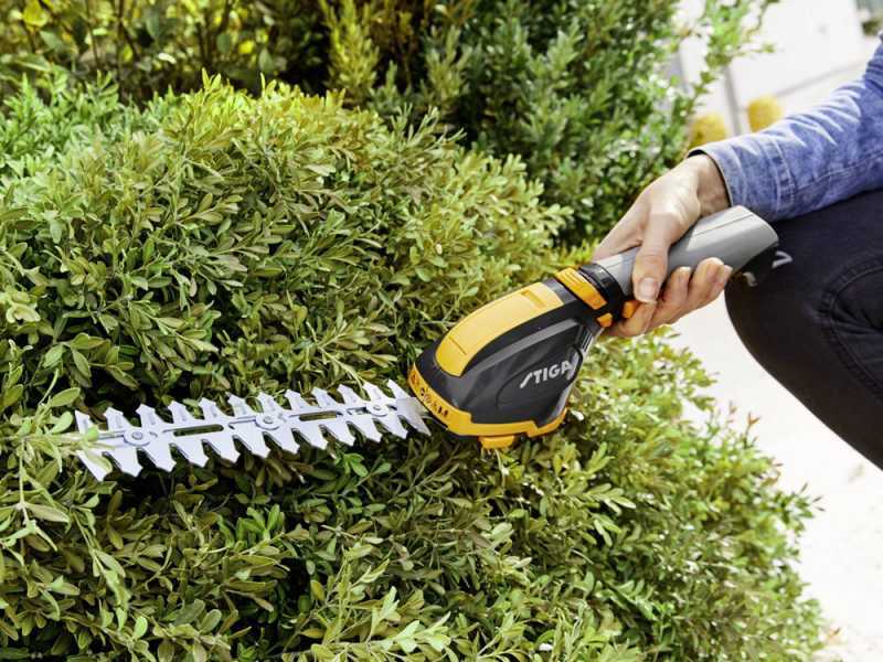 Stiga SGM 102 AE consente il taglio e la rifinitura del prato e delle siepi, grazie alle due lame facilmente intercambiabili incluse nella confezione.