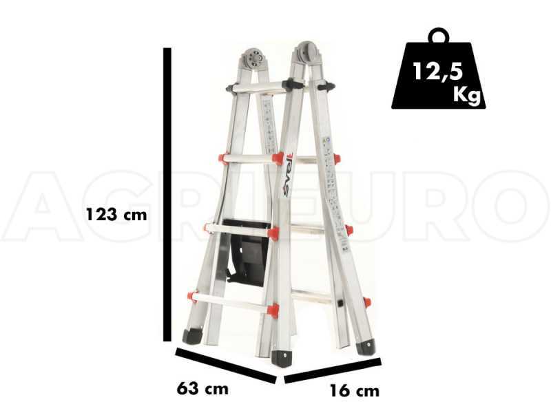 La Scalissima 8+8 è realizzata in alluminio estruso nervato a sfilo telescopico con base allargata. Concepita per uso professionale (ma anche per uso hobbistico), è utilizzabile sia come scala da appoggio, che doppia o zoppa