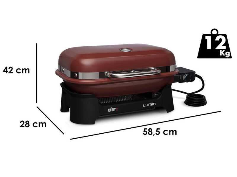 Il potente barbecue elettrico Weber Lumin Compact Red ha una griglia di cottura da 1166cm² realizzata in ghisa smaltata. Ha un alimentazione elettrica a 2,2 kW. Nella parte inferiore è presente una vaschetta portaleccarda rimovibile che agevola notevolmente le operazioni di pulizia del vostro barbecue